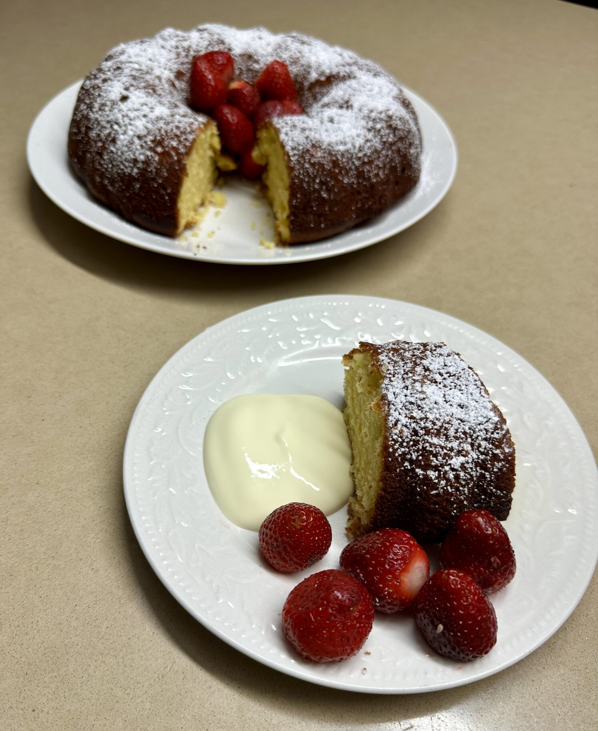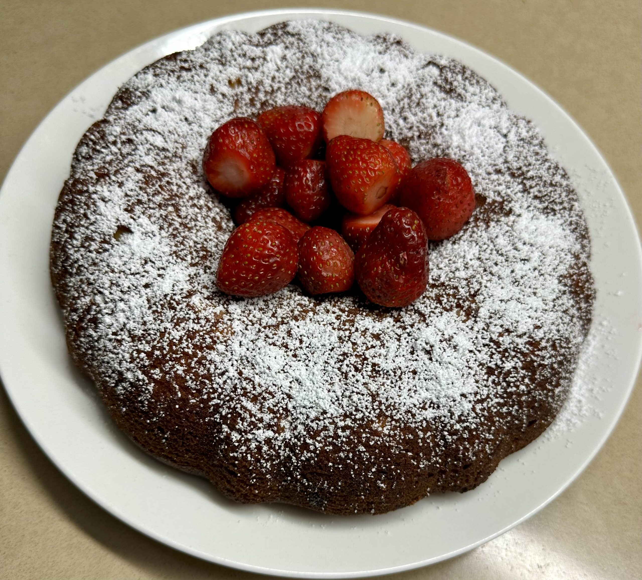 If the top gets too brown before the middle is ready, place some foil loosely over the top of the cake to stop the nuts from burning. When it’s ready the top of the cake will have an even colour, feel firm to the touch and a toothpick inserted in the middle will come out clean.