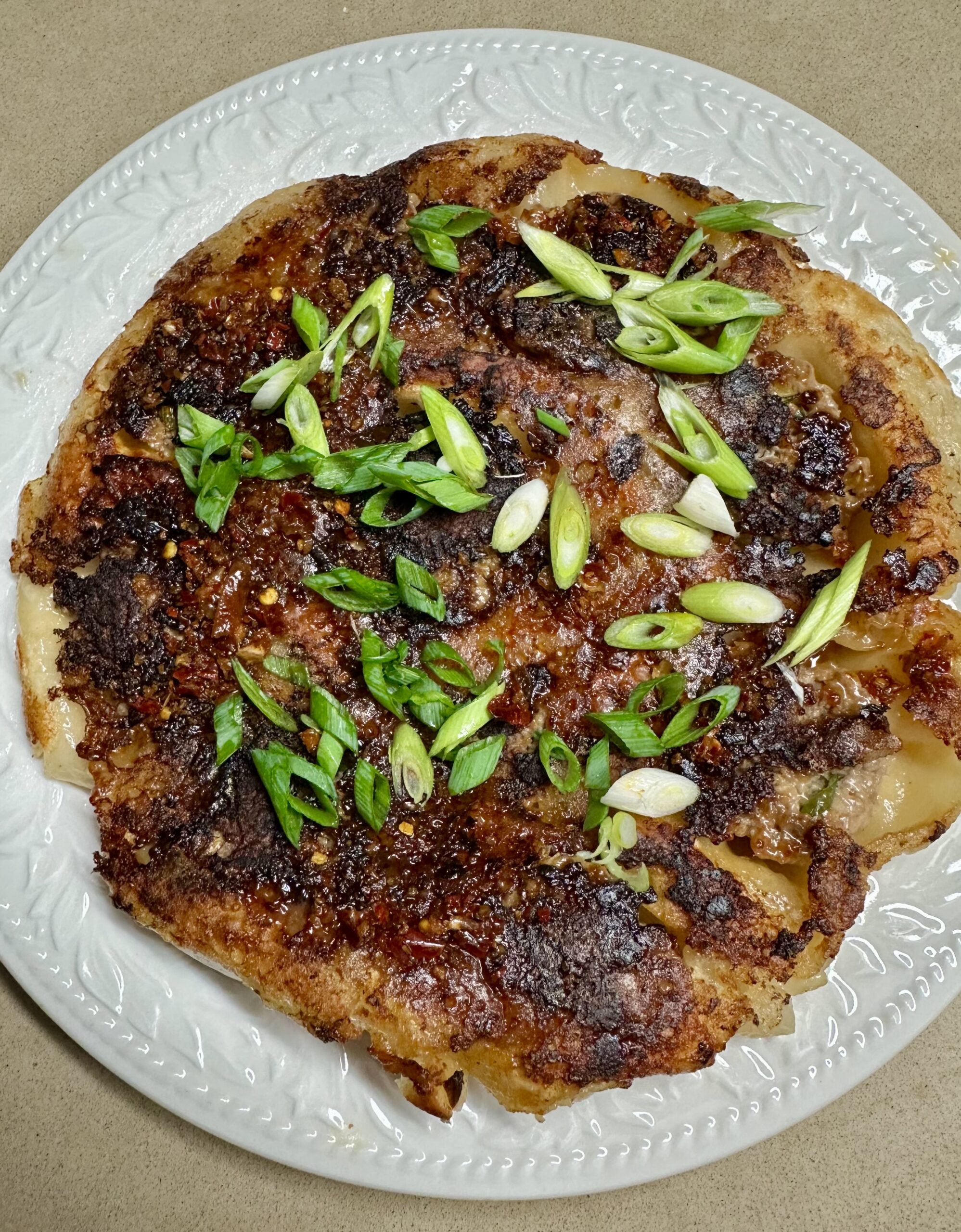 If you like crispy pork dumplings – called Gyoza or Pot Stickers – you will like this recipe for one big one. Variations have been going viral on social media, so I decided to give it a try and it was indeed delicious.