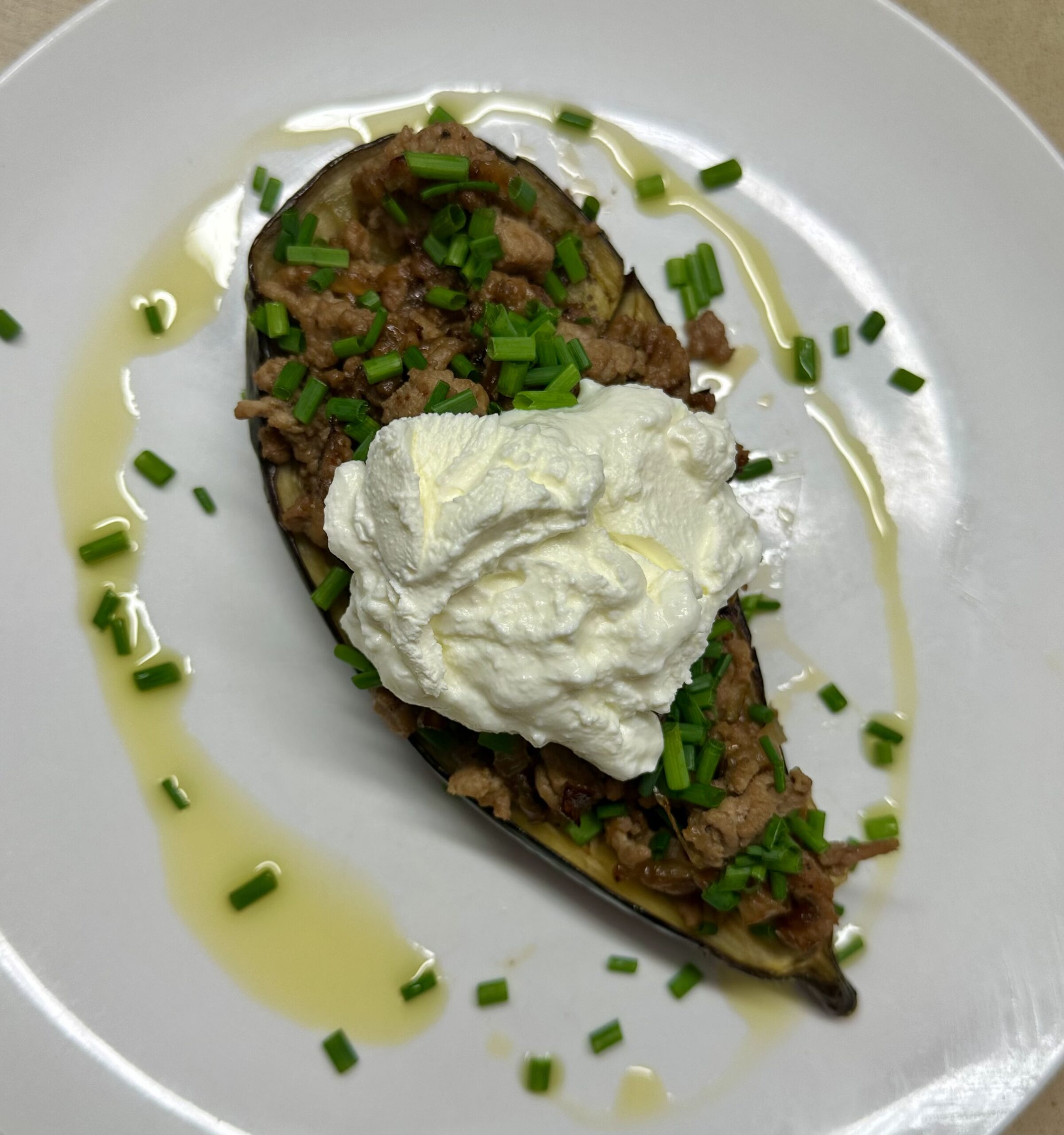 Place eggplant halves on two serving plates. Spoon over the mince, then garnish with a drizzle of olive oil, some snipped chives and a dollop of Greek yoghurt.
