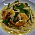 We started off with Prawn, Avocado and Tomato Tian with Green Shallot Dressing, adapted from a recipe by Curtis Stone which uses crab rather than prawns. Crab is expensive and often difficult to find, whereas cooked prawns are readily available and often on special. I had all the elements ready in the fridge and just had to assemble the tians before we sat down. In Curtis Stone’s recipe he used beefsteak tomatoes and managed to cut circles for the tops of the tians. My tomatoes weren’t big enough, so I had to use several pieces.
