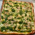 Line baking tin with one sheet of pastry, cover evenly with the spinach filling, then cover with the second sheet. Crimp the edges and cut off or fold in any overhang (that’s what I did in the photo). Mark the pie into 6 or 8 servings by cutting through the top layer. Brush with beaten egg and sprinkle with sesame seeds.